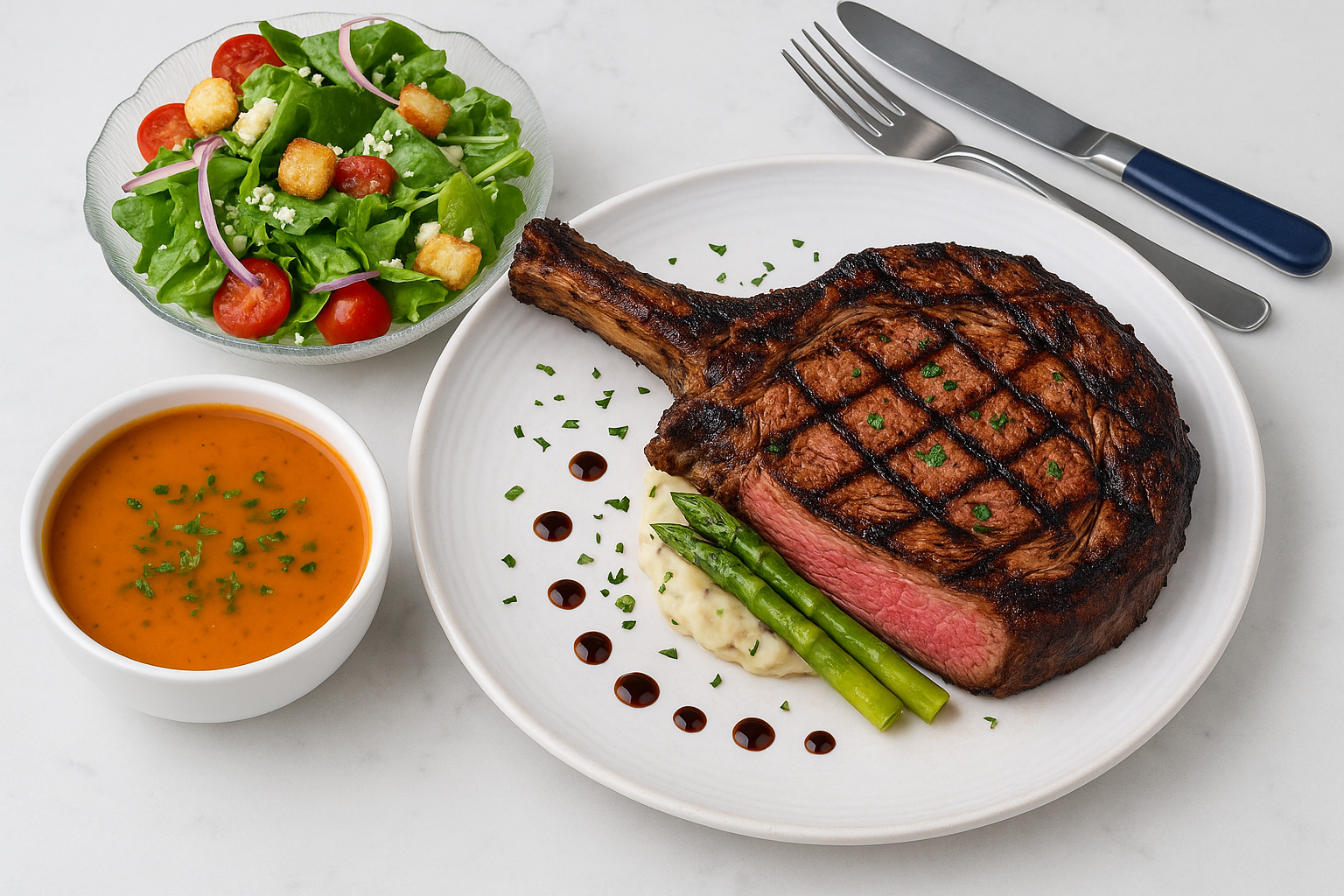 Start with a warm soup and a fresh salad, then enjoy a juicy 22oz Ribeye, grilled to perfection. A complete meal at an unbeatable price!